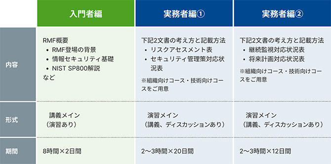 防衛分野における高度な専門性と豊富な支援実績を活かし、RMF教育プログラムの提供を開始。実践的な演習を通して、お客様社内におけるRMF対応のエキスパートを育成いたします。
